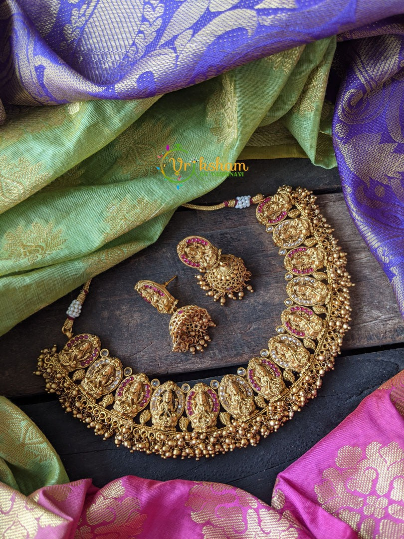Premium Temple Choker - Lakshmi -Multicolor (white, red) stone studded Lakshmi idols as length of the neckpiece. Cluster golden ghungroo finish. Comes with pair of Lakshmi stud jhumkas.