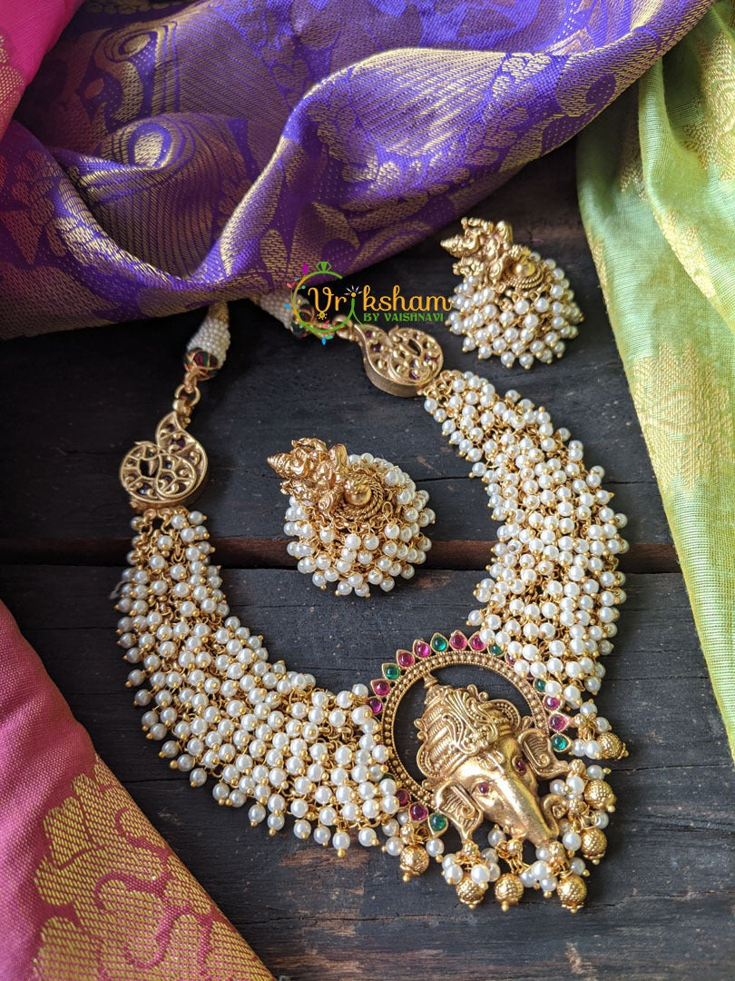 Temple Choker Neckpiece -Ganesha -Antique Gold look finish, cluster pearl; centre lord Ganesha face with alternate green red stones. Comes with pair of cluster pearl jhumkas.