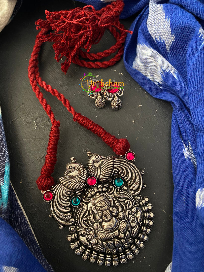 Temple Ganesh Pendant Rope Neckpiece-RED rope– Oxidized Kolhapuri rope pendant neckpiece; pink, green stone studded pendant. Comes with ganesh studs.