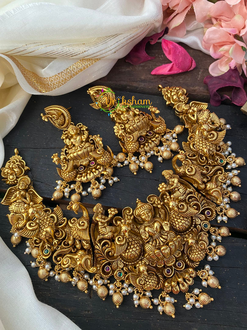 Intricate Antique Temple Lakshmi Short Neckpiece -Heavy temple design neckpiece coated antique gold polish with lakshmi and peacocks and Pearl and Gold finish. Comes with matching danglers.