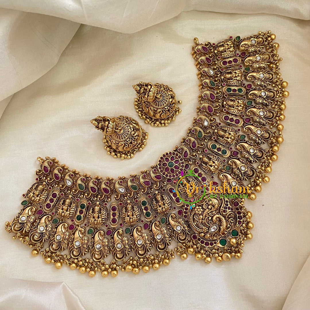 Premium Antique Temple Lakshmi Short Neckpiece-Peacock-Green Bead-Intricately Designed Temple Neckpiece ad stone centre layer of peacock and another layer of lakshmi idol; comes with matching ear danglers.