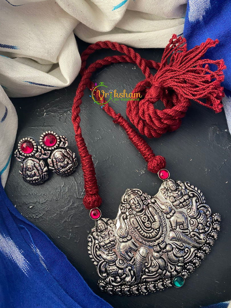 Shri Vishnu Temple Pendant Rope Neckpiece-RED rope– Oxidized Kolhapuri rope pendant neckpiece; pink, green stone studded pendant. Comes with lakshmi studs.