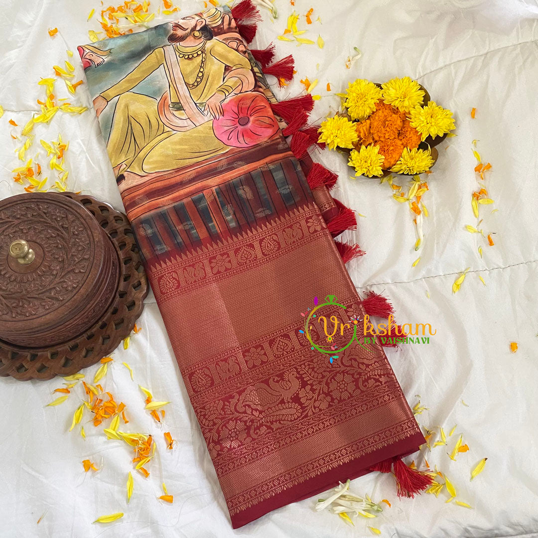 The Royal Kalamkari Semi Soft Silk Saree – with traditional border – Kalamkari digital print pattern throughout the saree; comes with Blouse attached. Two side contrast border and pallu.