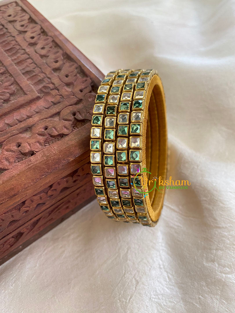 Thin Silk Thread Kundan Bangle -White Green-Square kundan stone (glossy stone) festive bangles , Comes as 4 bangles only.