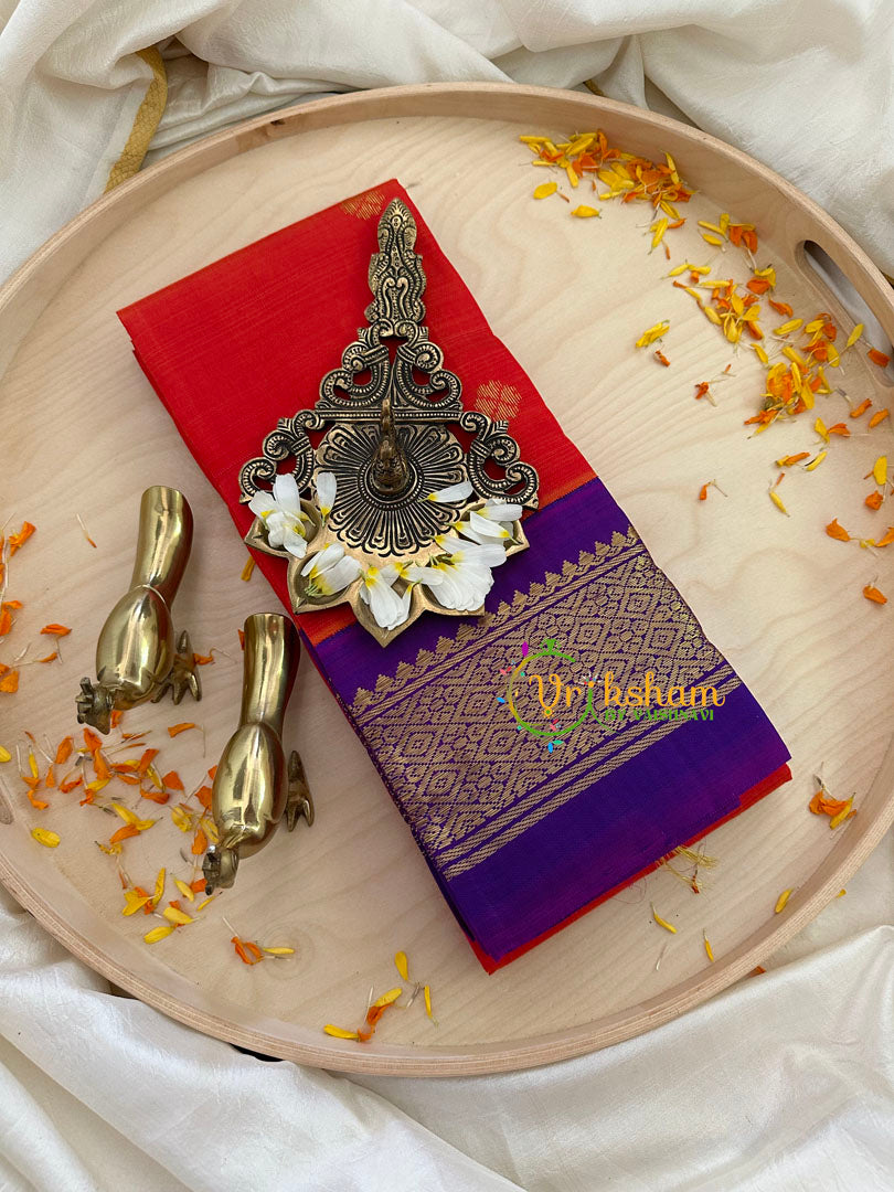 Red with Purple Thiribhuvanam Silk Saree with mustard yellow border – Comes with SILK MARK - Festive wear saree – Butta work throughout the saree; Traditional contrast border and pallu.