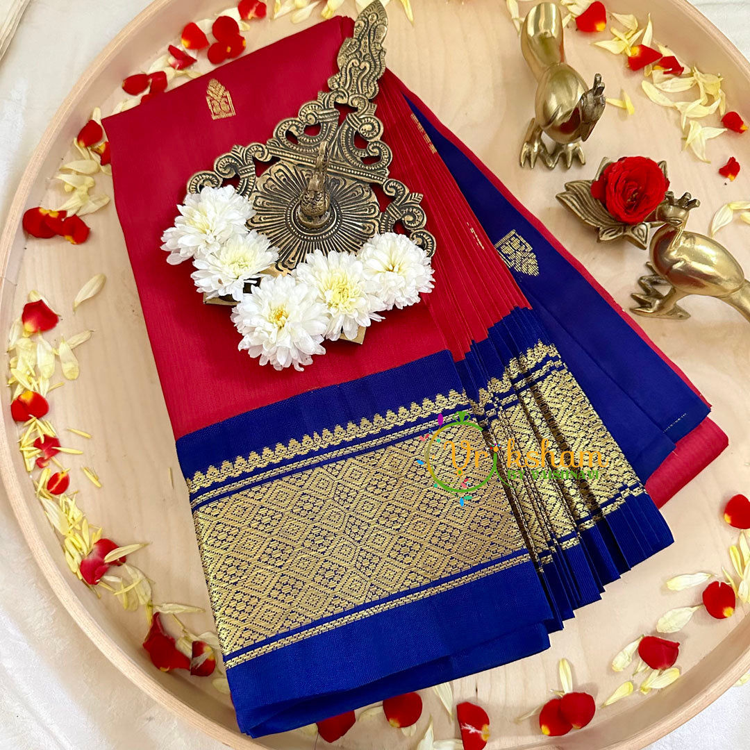 Material: Kumkum Red Thiribhuvanam Silk Saree with blue border; comes with silk mark.