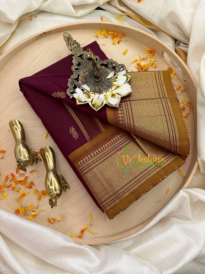 Arakku Maroon Thiribhuvanam Silk Saree with mustard yellow border – Comes with SILK MARK - Festive wear saree – Butta work throughout the saree. Traditional contrast border and pallu.