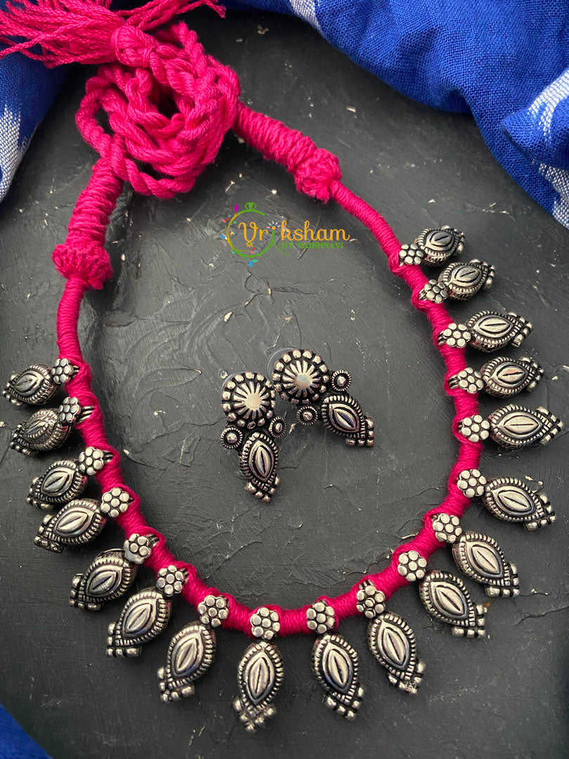 Pink Thread Kolhapuri Silver Neckpiece (oxidized German silver) ;Handmade; Silver look alike jewelry ;one of a kind short neckpiece with adjustable black back rope/thread.