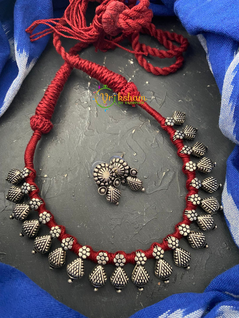 Red Thread Kolhapuri Silver Neckpiece (oxidized German silver) ;Handmade; Silver look alike jewelry ;one of a kind short neckpiece with adjustable red back rope/thread.