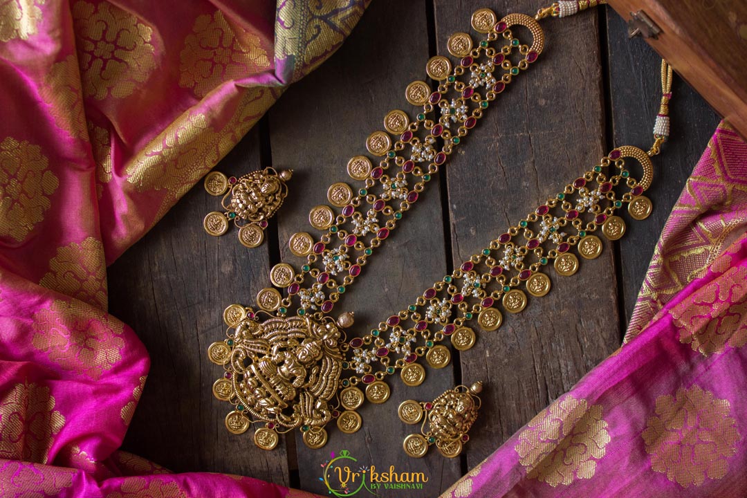 Three Layer gold look alike premium quality Lakshmi Haaram. Comes with red-green stones and has a beautiful traditional look with coins