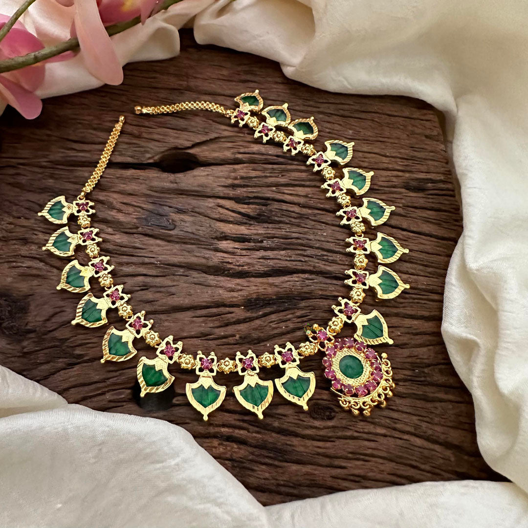 Elevate your jewellery collection with our exquisite handcrafted Tradional Kerala Palakka Neckpiece. Adorned with 9 beautiful Palakka, this piece pays homage to the traditional Kerala culture. Made with precision and attention to detail, it is a timeless addition to any outfit, reflecting elegance and luxury.