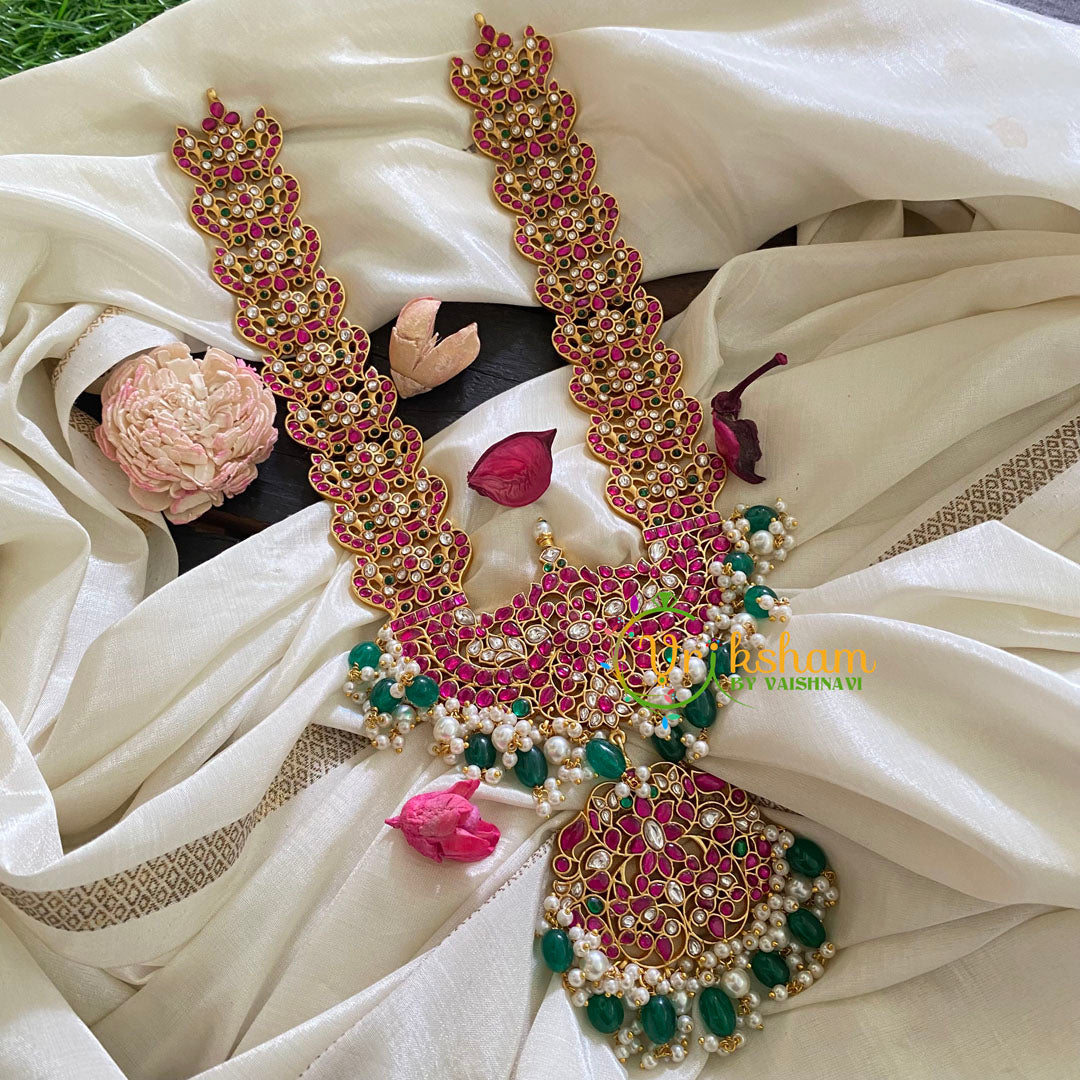 Traditional Jadau Kundan Bridal Haram- dual peacock pattern with large pretty pendant is one of our highest quality royal jewelery with pearl and Green Bead finish.
