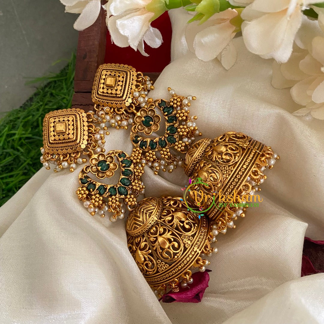 Traditional Three Tier Long Jhumkas-Green ad stone studded in heart shape centre piece; top geometrical stud and bottom jhumkas. Pearl Finish.