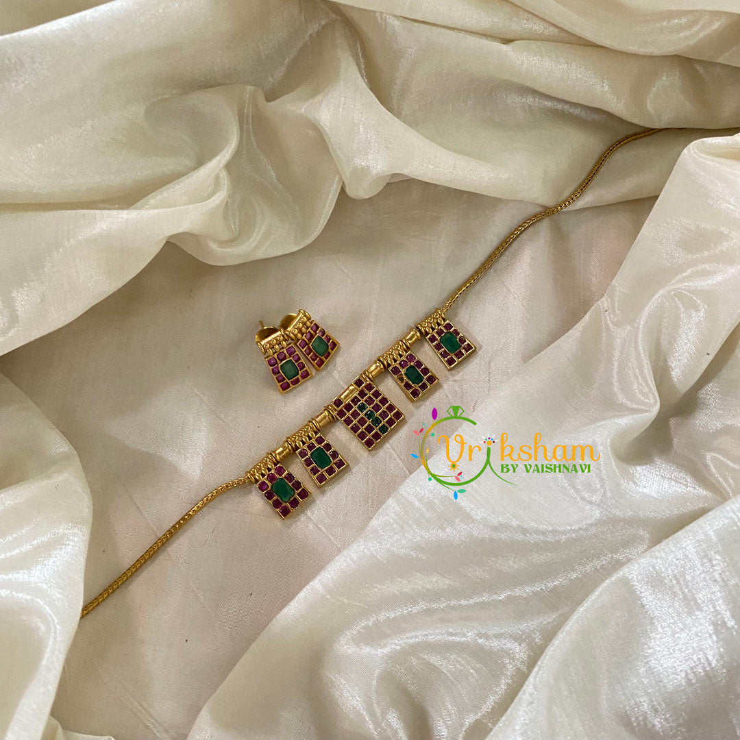 Traditional AD Stone Choker Neckpiece – red green AD stone studded elephant designed short neckpiece with gold bead finish. Comes with matching ear studs.