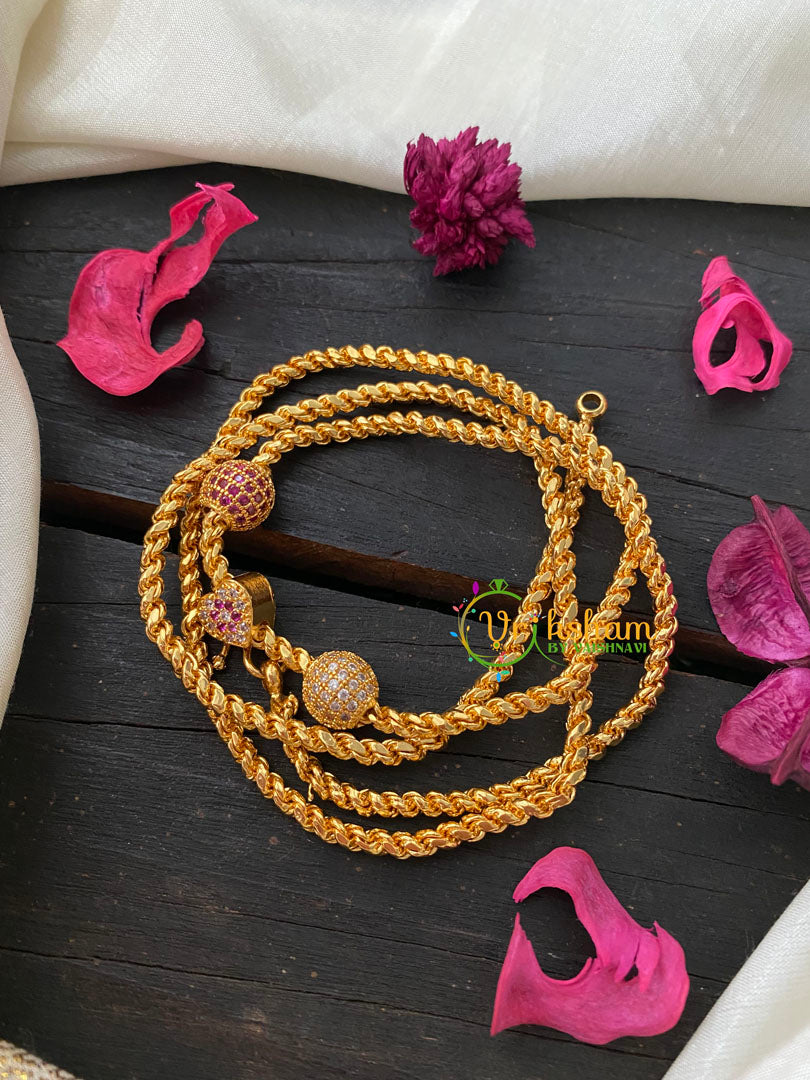 Traditional AD Stone Mogappu Chain-Red White-Heart Round– ad stone studded one heart and 2 round ball mugappu/mogappu chain.