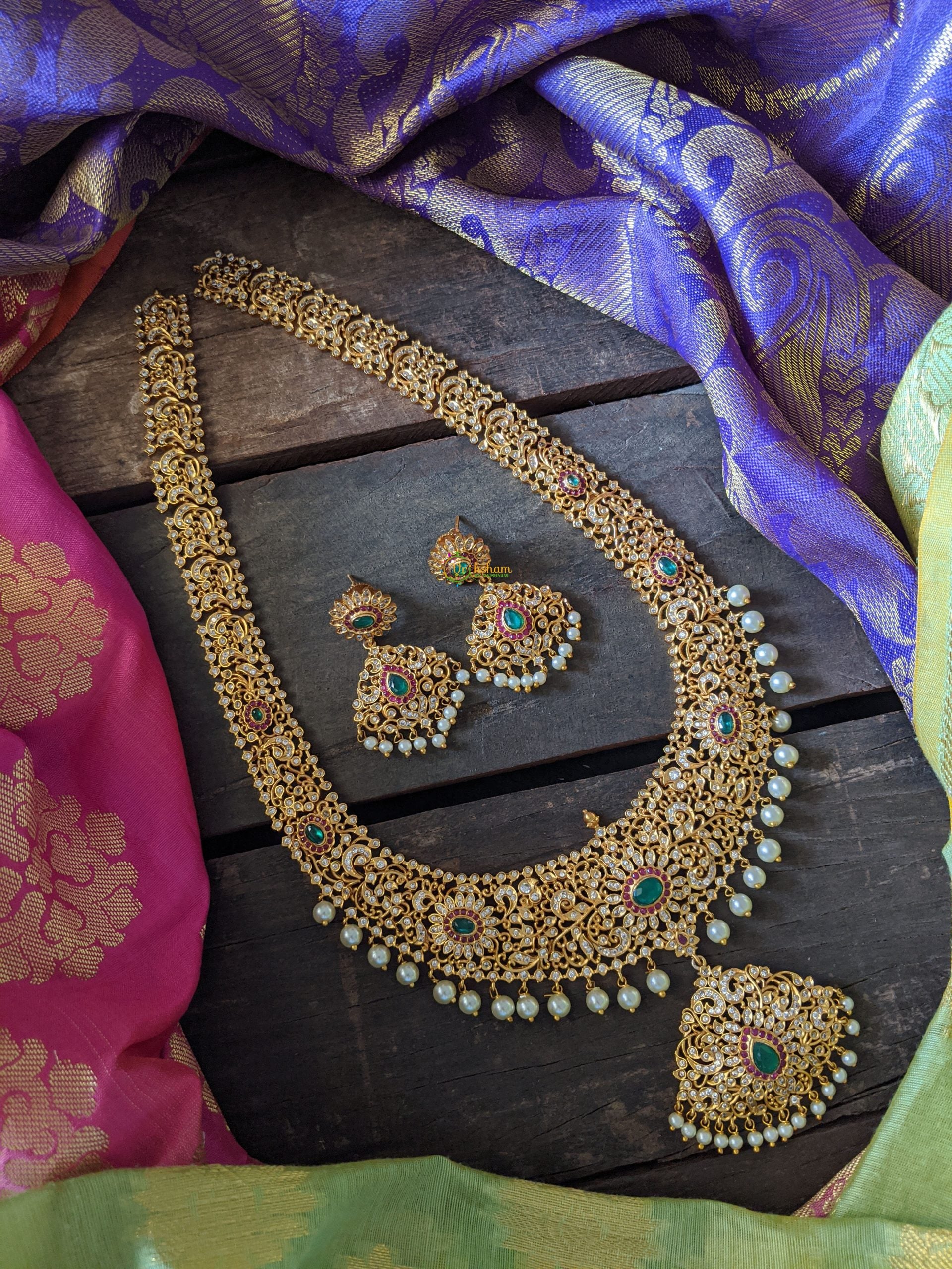 Traditional American Diamond Long Neckpiece - This is a traditional american diamond neckpiece, this neckpiece has a very beautiful and intricate design with green stone at the center.