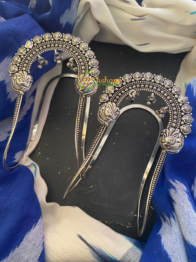 Traditional German Silver Vangi – Kolhapuri make, peacock and ghungroos pattern; one of a kind silver look alike armlet.