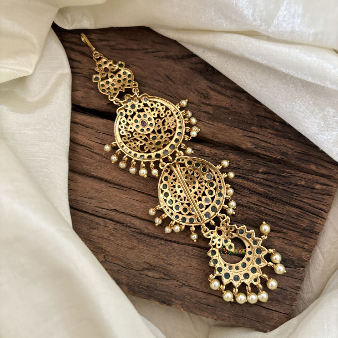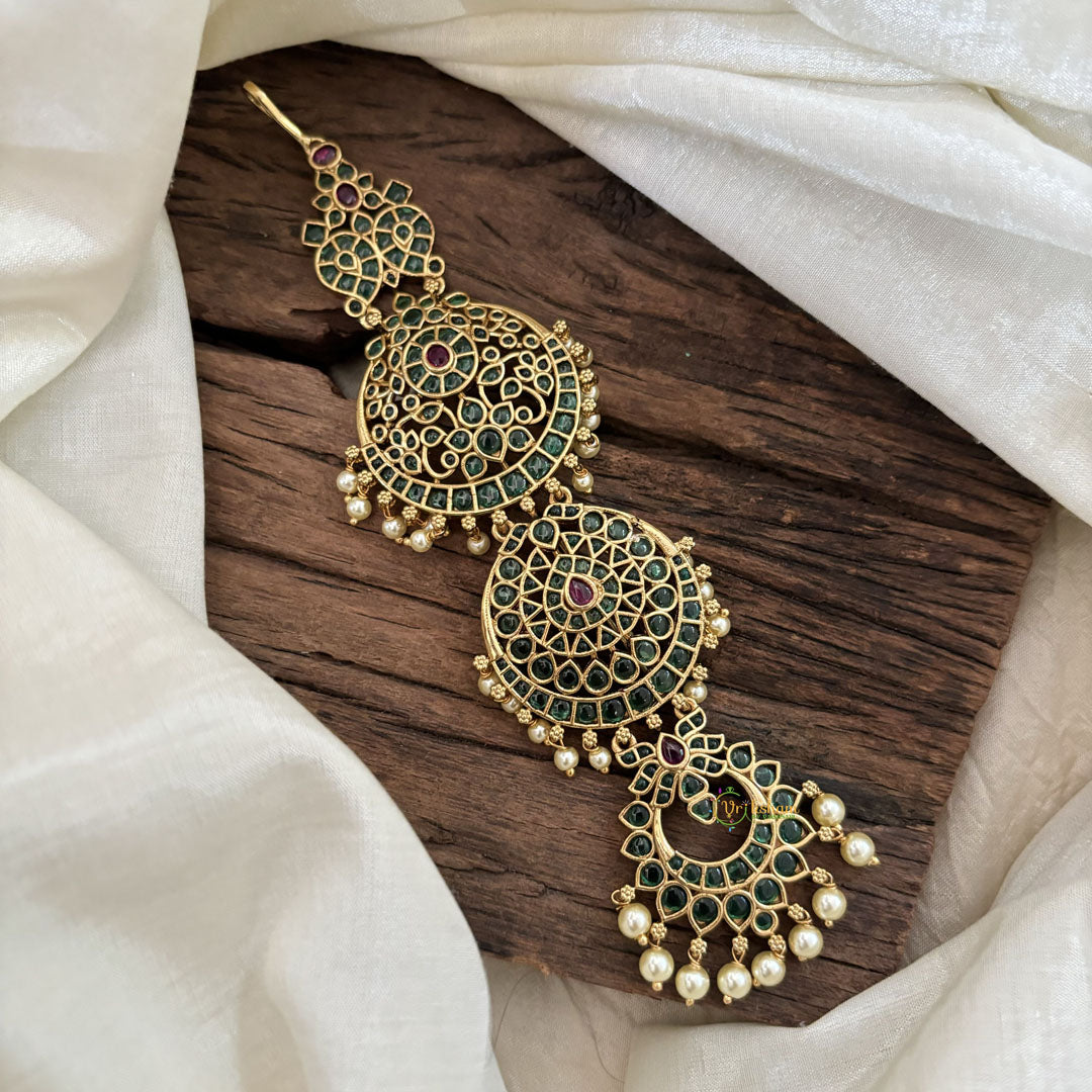 Traditional Kemp Hanging Jada Billai -FourTier Bun Billai -GREEN RED– Hair Accessory- Floral patterned imitation kemp stone set single piece billai.