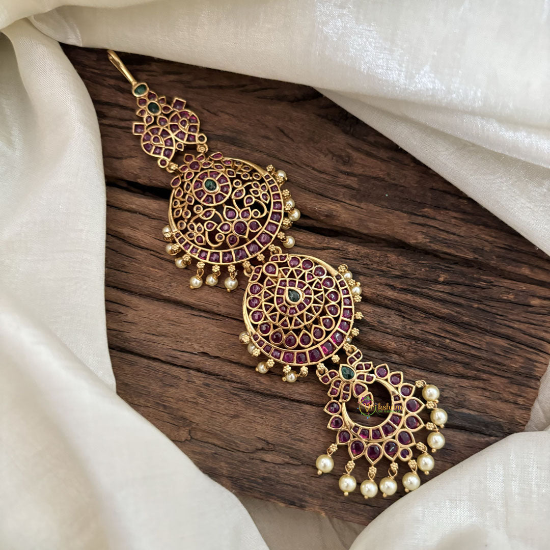 Traditional Kemp Hanging Jada Billai -FourTier Bun Billai -RED GREEN– Hair Accessory- Floral patterned imitation kemp stone set single piece billai.