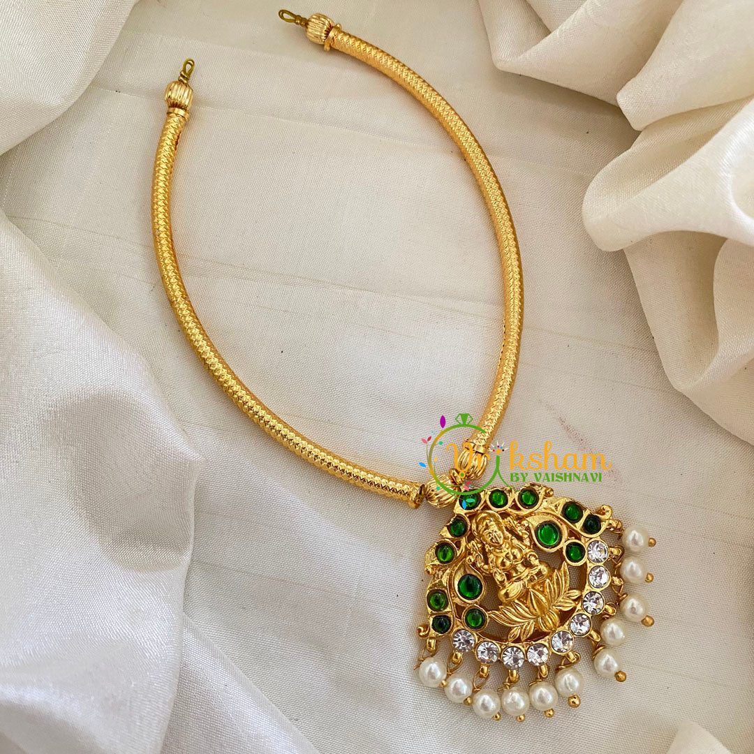 Green Traditional Kemp Lakshmi Addigai -Green Kemp imitation kemp stones studded pendant with pearl finish. NECKPIECE ONLY.