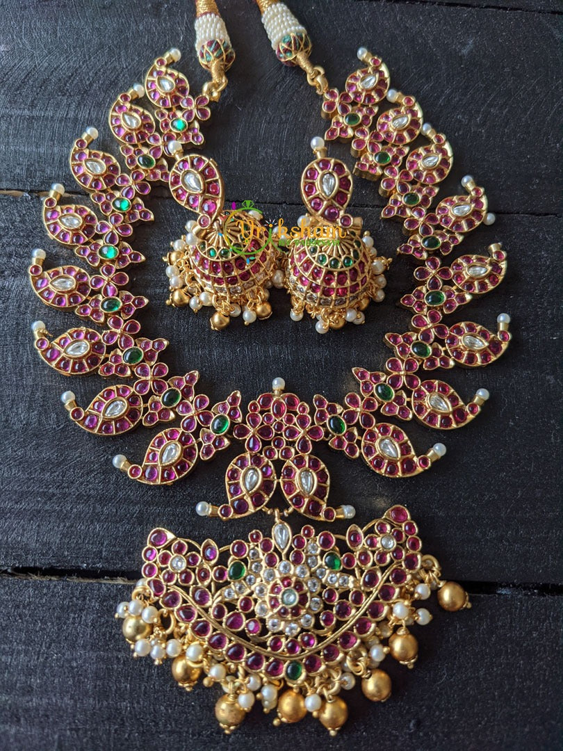 Traditional Kemp Maanga Neckpiece with pendant -Red Green and White kemp neckpiece with matching earrings.
