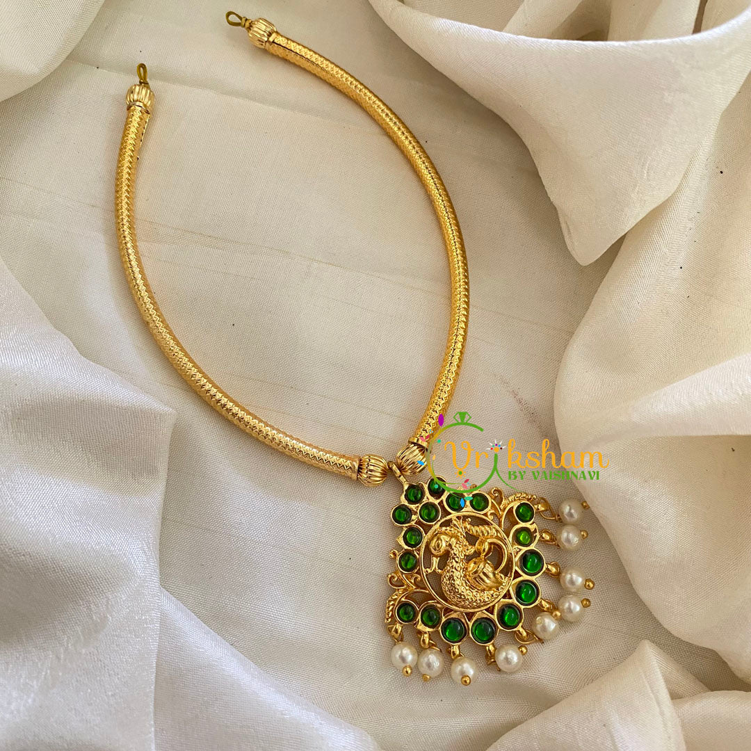 Green Traditional Kemp Peacock Addigai -Green Kemp imitation kemp stones studded pendant with pearl finish. NECKPIECE ONLY.