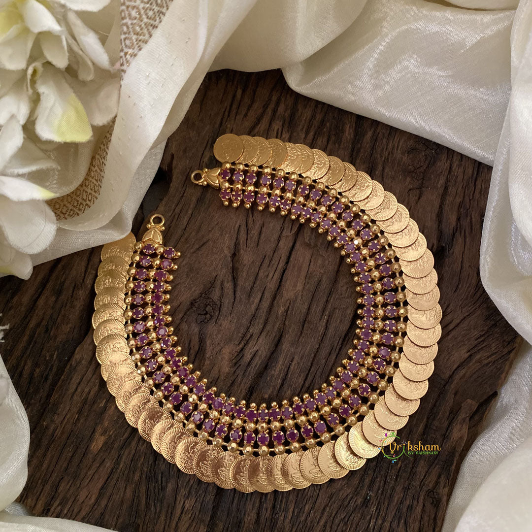 Traditional Kerala Lakshmi Coin Neckpiece-Pink AD Stone-Traditional Kerala Temple jewelry; coins arranged along the length of the neckpiece- lakshmi Coins. Neckpiece Only.
