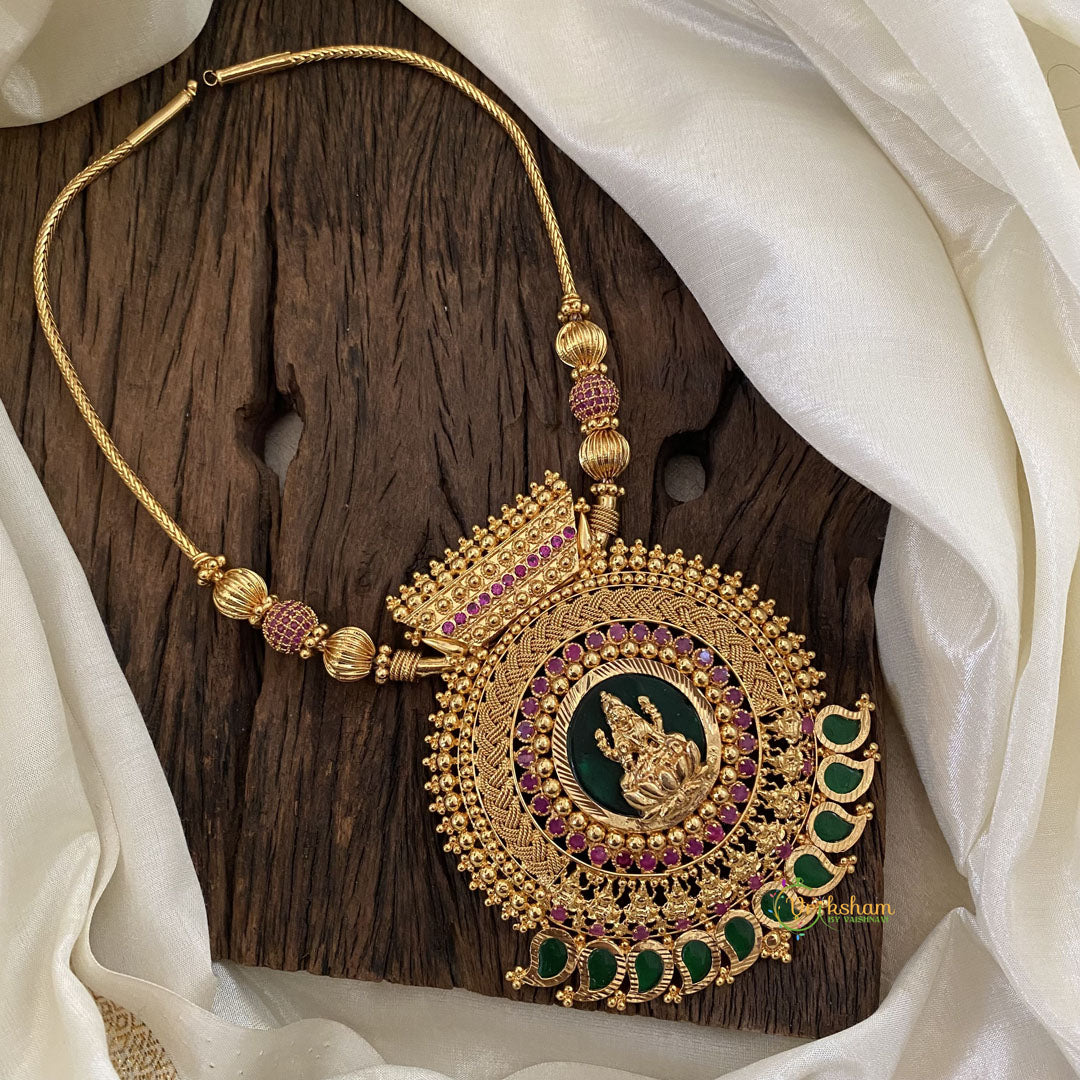 Traditional Kerala Lakshmi Pendant Neckpiece -Traditional Kerala Temple jewelry- ad stone and green kemp studded on lakshmi idol pendant.
