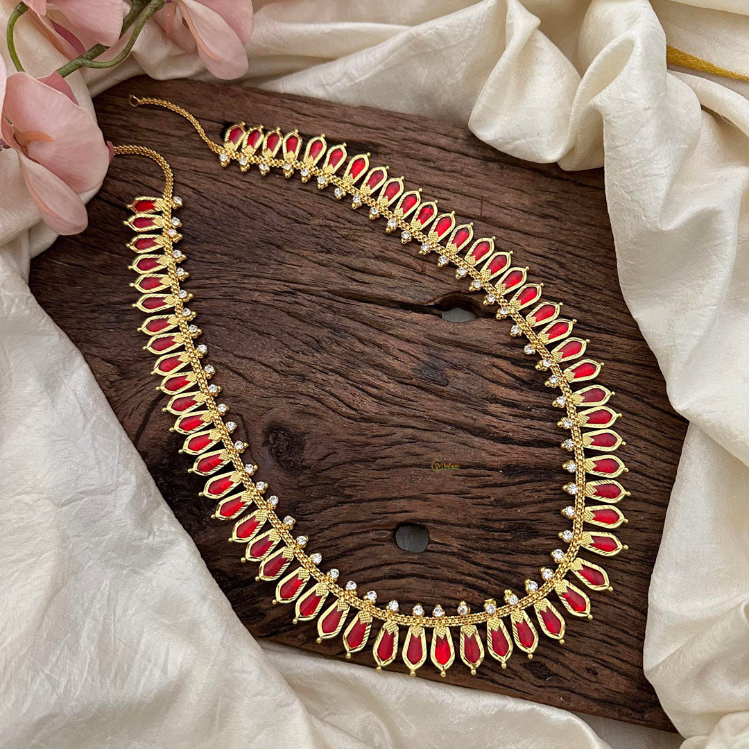 Experience the exquisite craftsmanship of our Traditional Kerala Naga Padam Haram. Handcrafted with precision, the intricate design of this necklace is inspired by the traditional art of Kerala. Adorned with a vibrant red Sone, this piece is a testament to your refined taste in luxury.