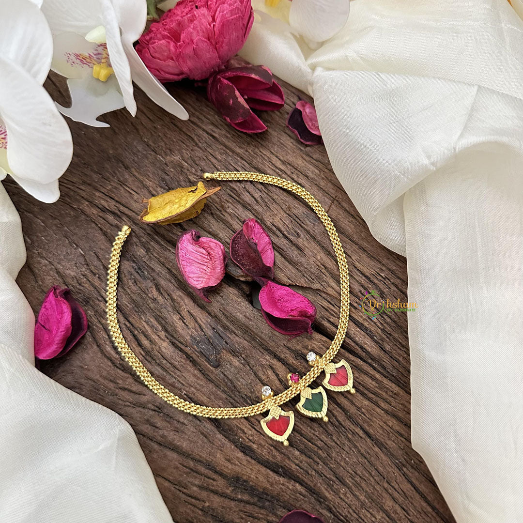 Introducing our exquisite Traditional Kerala Palakka Neckpiece in stunning Red-Green-Red. This luxurious piece features three small pendants that delicately drape around the neck, adding a touch of sophistication and cultural heritage. Elevate any outfit with this exclusive neckpiece.