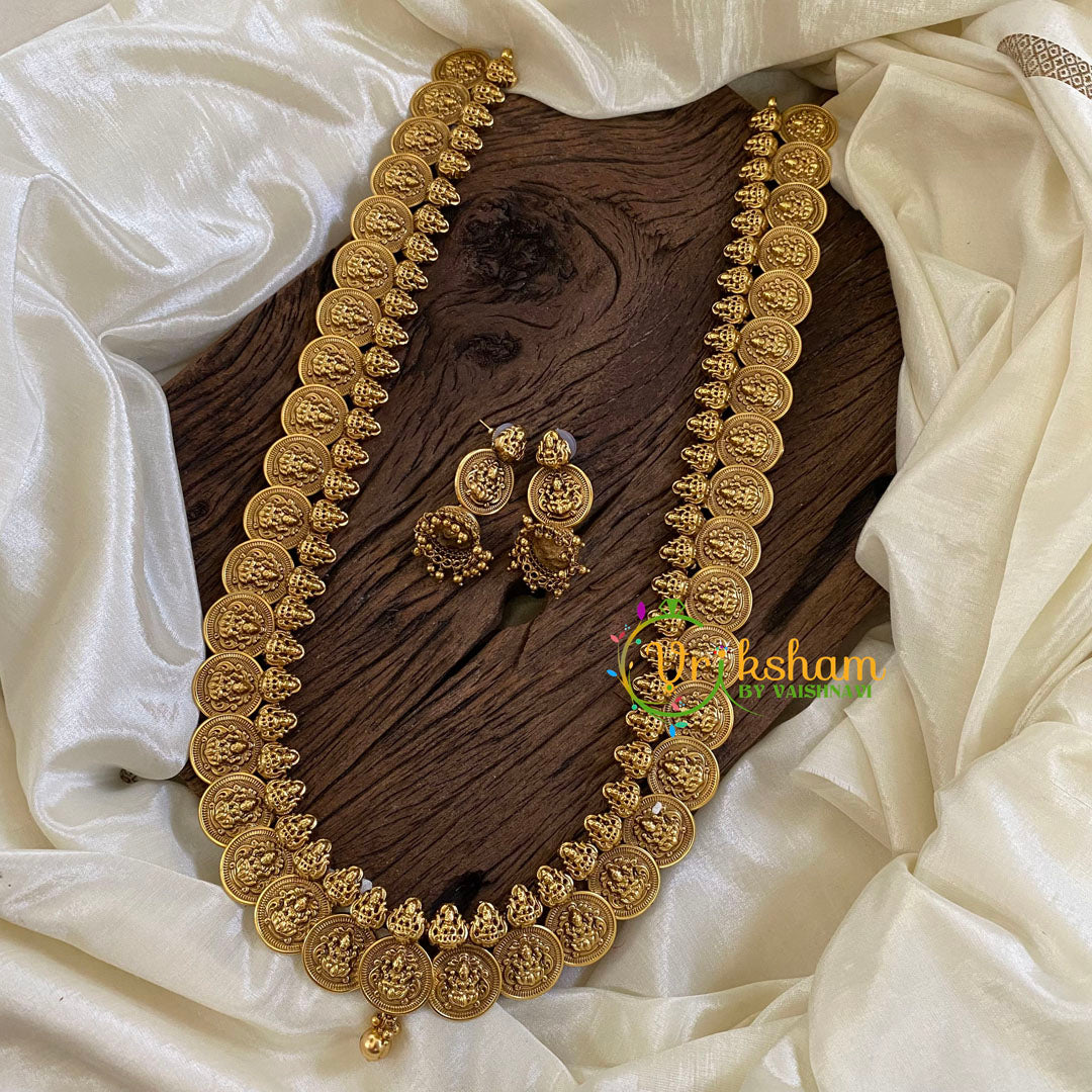 Premium Traditional Lakshmi Kaasumala Long Neckpiece -NO STONE Lakshmi haram-Intricately Designed Temple Neckpiece; comes with matching ear earrings.
