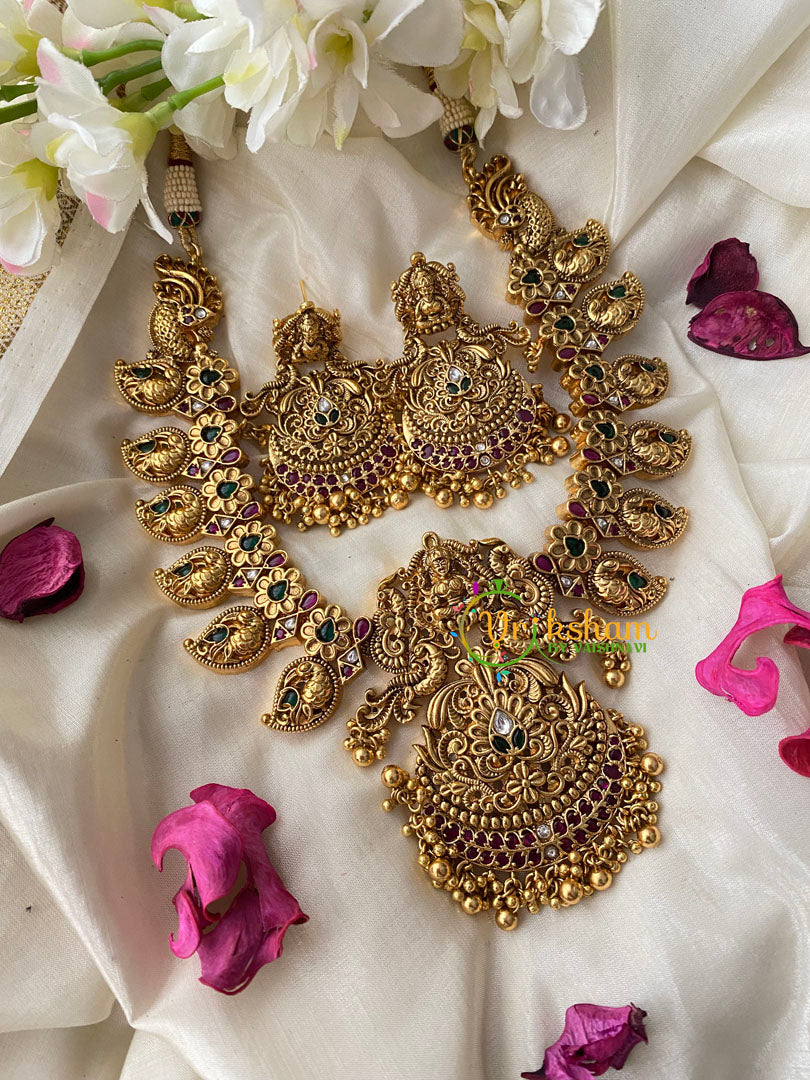 Traditional Lakshmi Pendant Maanga Peacock Neckpiece- Short Neckpice is an Elegant and Premium Quality matt finish short neckpiece; comes with earrings.Gold Bead Finish.