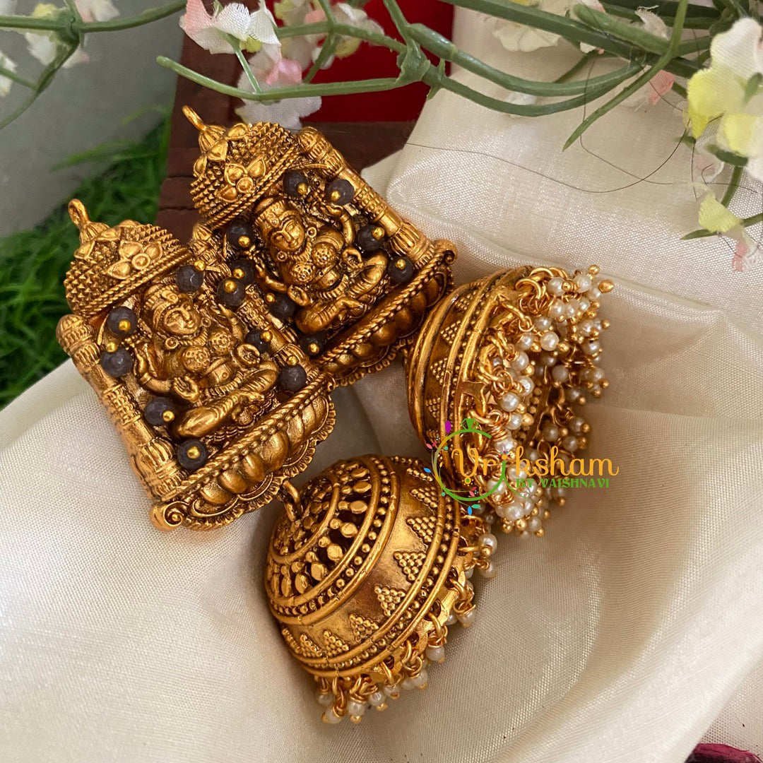 Beaded Traditional Lakshmi Temple Jhumkas-Dark Grey bead in geometrical Lakshmi stud and pearl finish bottom jhumkas.
