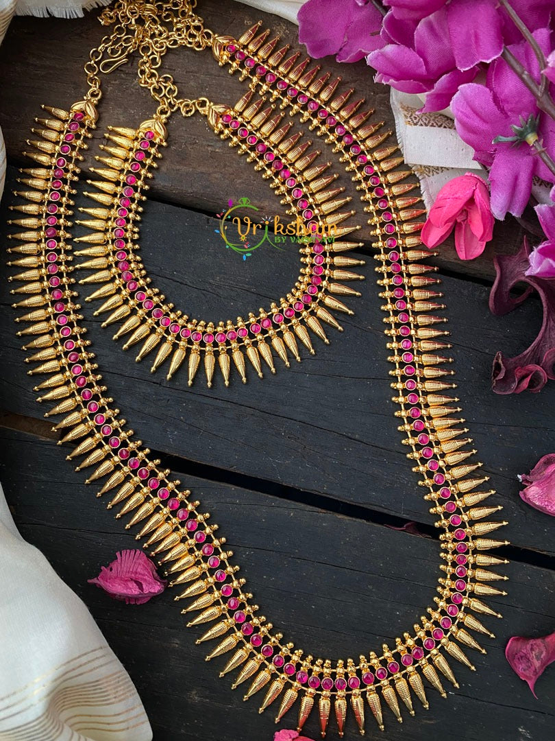 Gold Alike Traditional Mullai Haram; Choker-Red Stone-Spike Gold Haram and short neckpiece-Premium quality finish with RED STONE haram and short neckpice. NECKPIECE ONLY.