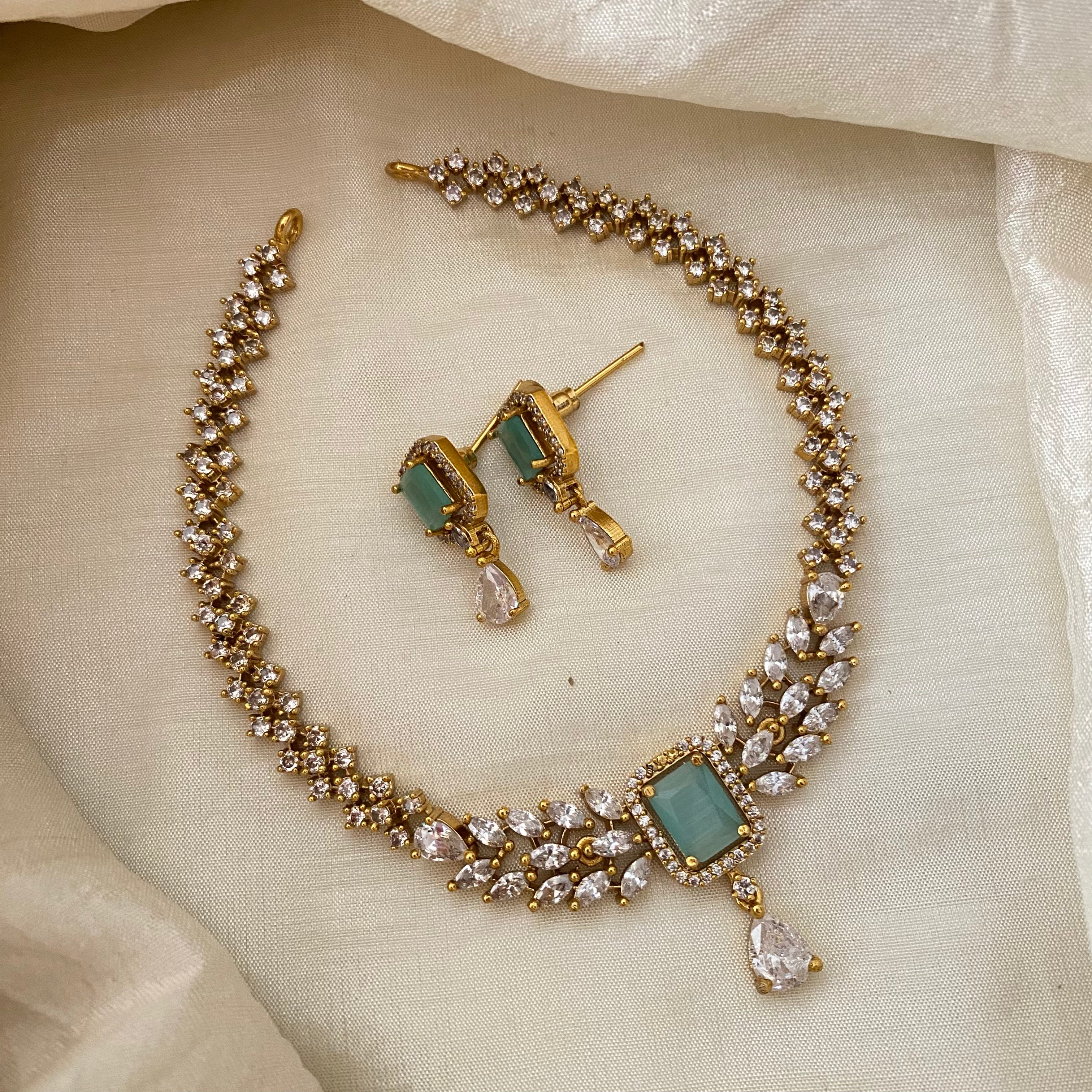 Trendy AD Stone Short Neckpiece-Aqua Green- Premium gold look alike AD stone patterned short neckpiece with earrings.