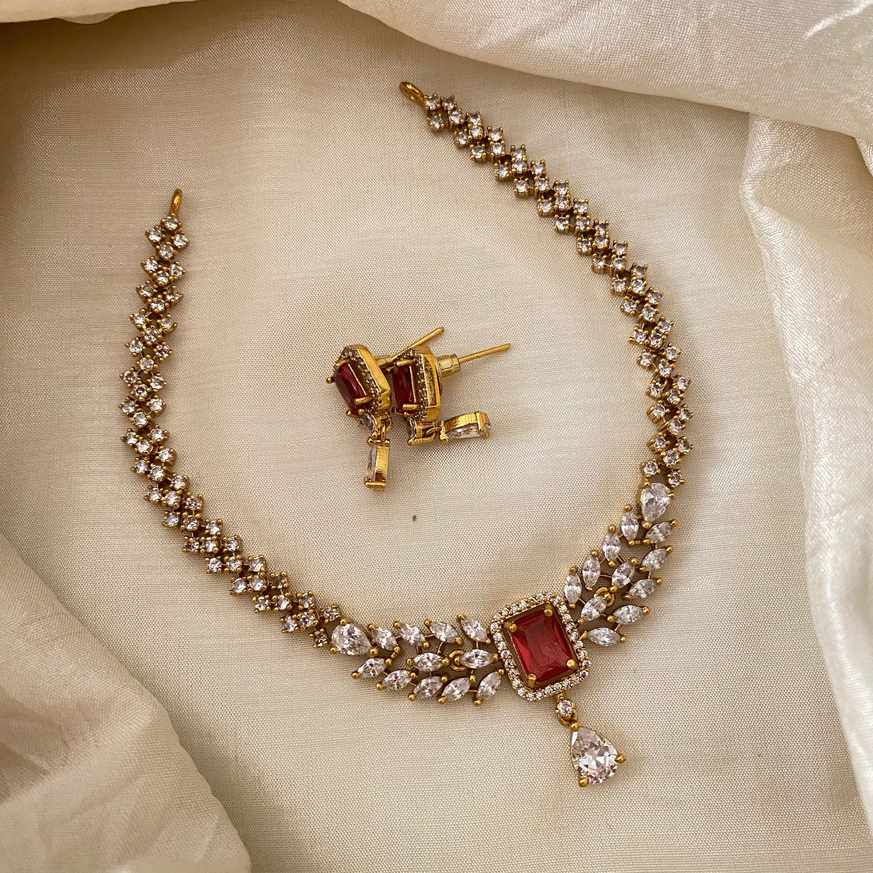 Trendy AD Stone Short Neckpiece-Red- Premium gold look alike AD stone patterned short neckpiece with earrings.