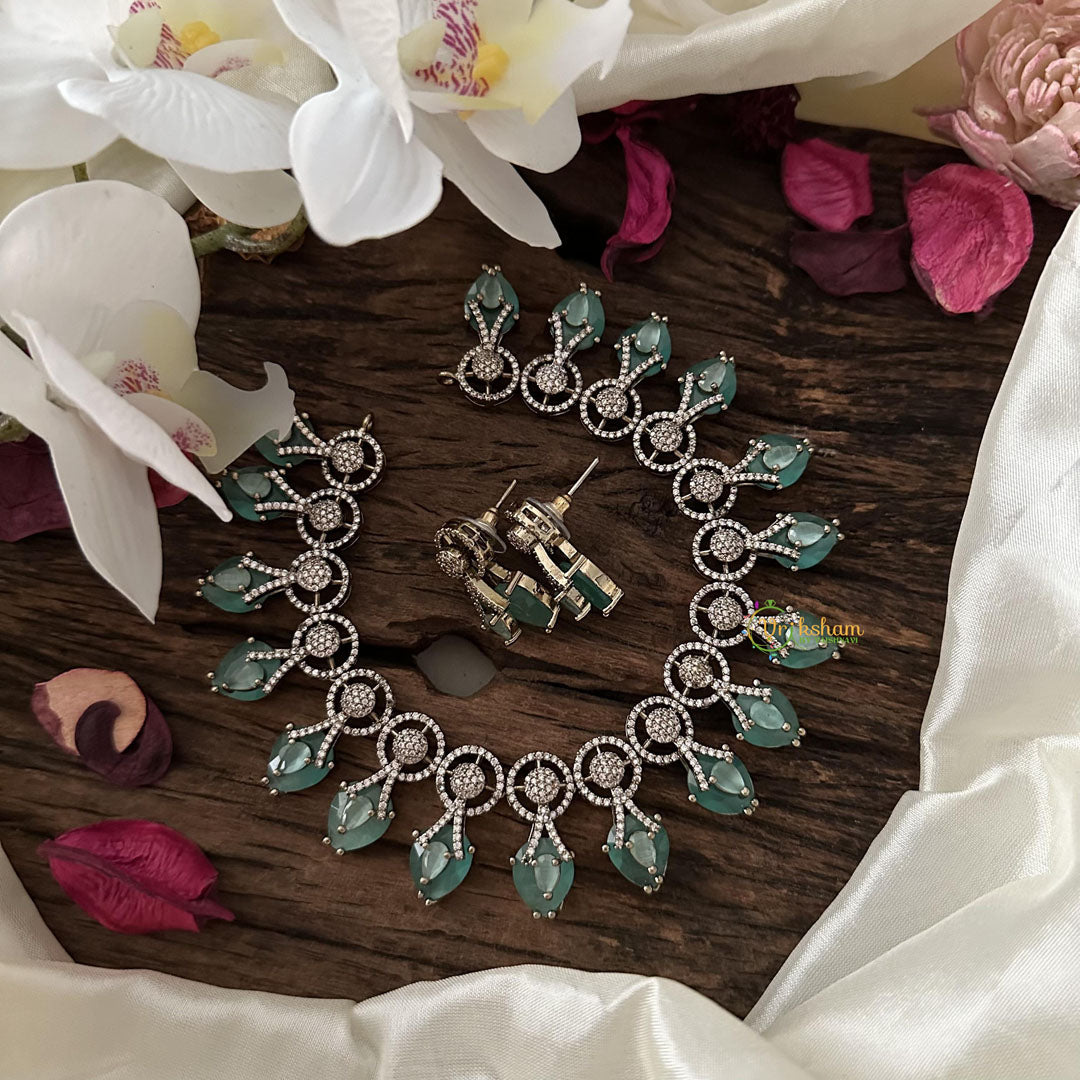 This stunning neckpiece features a trendy Aqua Green Victorian design adorned with sparkling diamonds. Elevate any outfit with this elegant and exclusive piece, inspired by the sophistication of vintage fashion. A true statement of luxury and artistry.