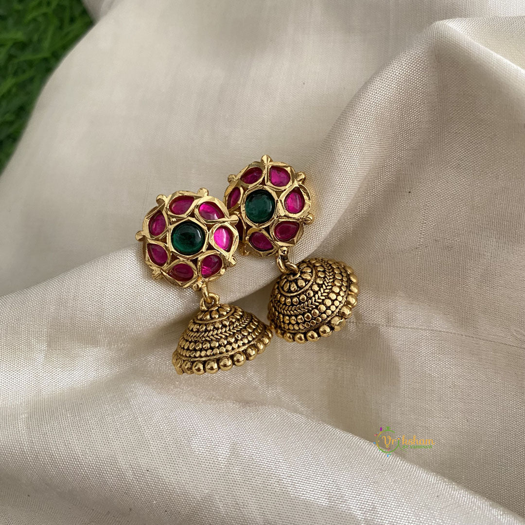 Trendy Gold Alike Floral Jhumkas - Trendy gold look alike Jhumkas floral pattern with red green non precious color stones to slay your pretty occasions.
