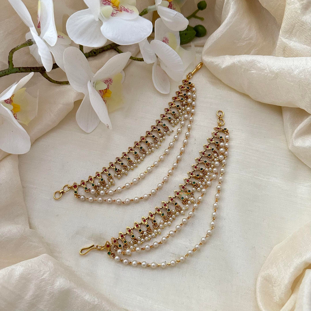 Elevate your look with our trendy 3 layer maatil-ear chain. Embellished with red and green AD stones, this piece is a testament to sophistication and artistry. Add a touch of luxury and exclusivity to your style with this statement accessory.
