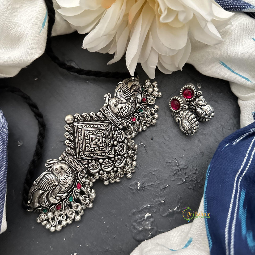 Elevate your style with our trendy silver dual peacock choker. This elegant piece is adorned with two intricately designed peacocks, and comes with matching earrings for a complete look. Make a bold statement with this luxurious and exclusive choker.