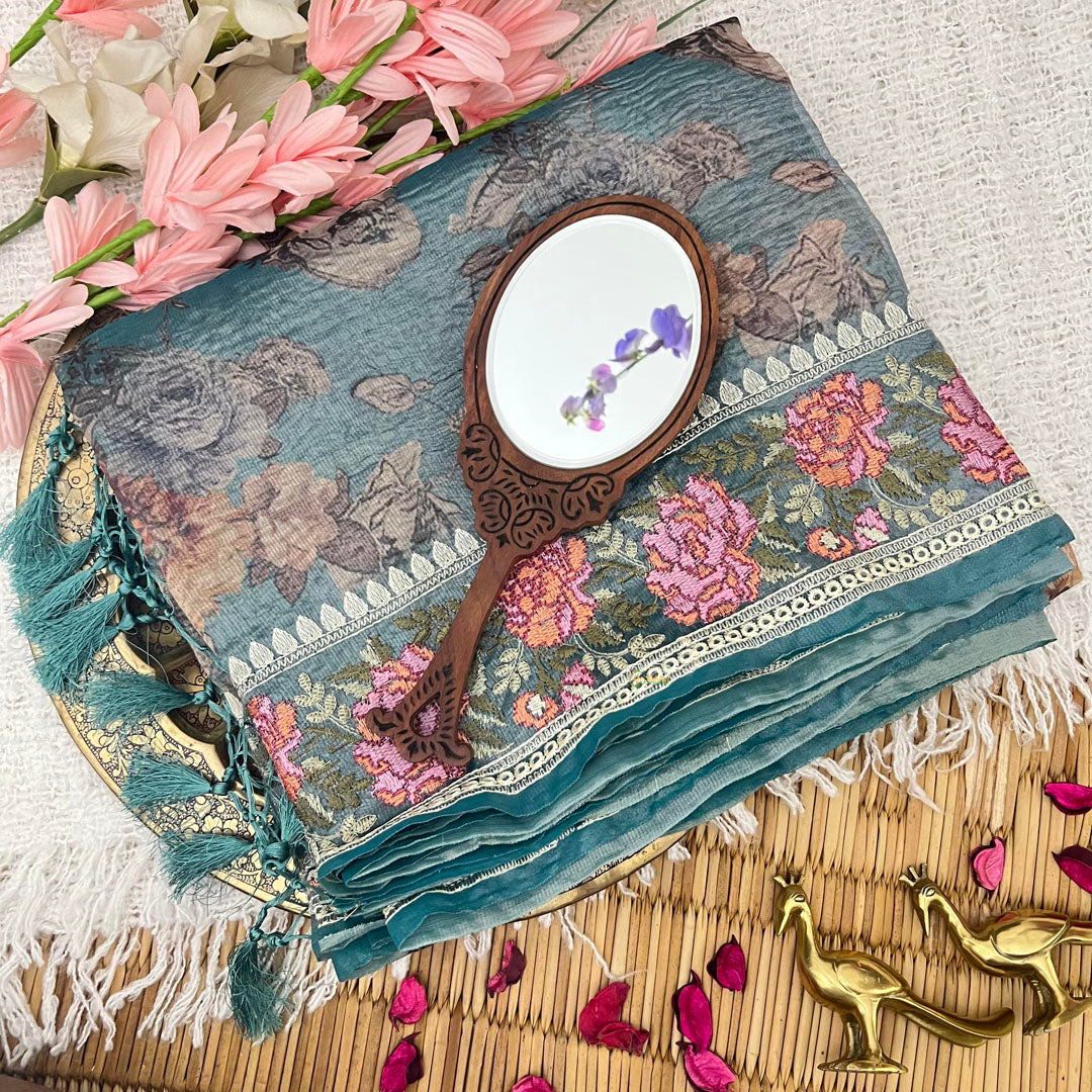 Luxurious and exclusive, our Turquoise Sita Ramam Floral Crush Organza Saree boasts a stunning digital floral print. Handloomed and adorned with hand embroidery on the border, it exudes artisanal craftsmanship. Complete with tassels on the pallu and an attached blouse, this saree is a perfect blend of traditional and modern.