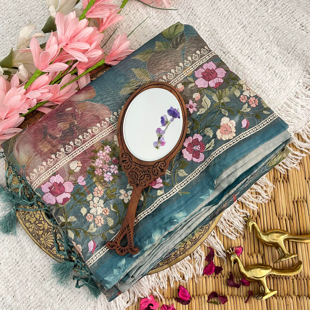 Luxurious and exclusive, our Turquoise Sita Ramam Floral Crush Organza Saree boasts a stunning digital floral print. Handloomed and adorned with hand embroidery on the border, it exudes artisanal craftsmanship. Complete with tassels on the pallu and an attached blouse, this saree is a perfect blend of traditional and modern.