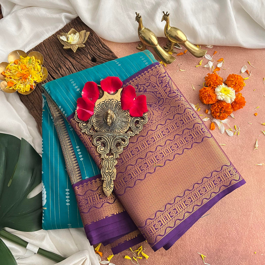 Indulge in opulence with our Turquoise and Purple Border Kanchi Silk Saree. The vibrant turquoise vairaoosi paired with a rich purple border creates a striking contrast, adorned with intricate silver zari work on saree and golden zari work on border. Elevate your style with this luxurious and exclusive saree.