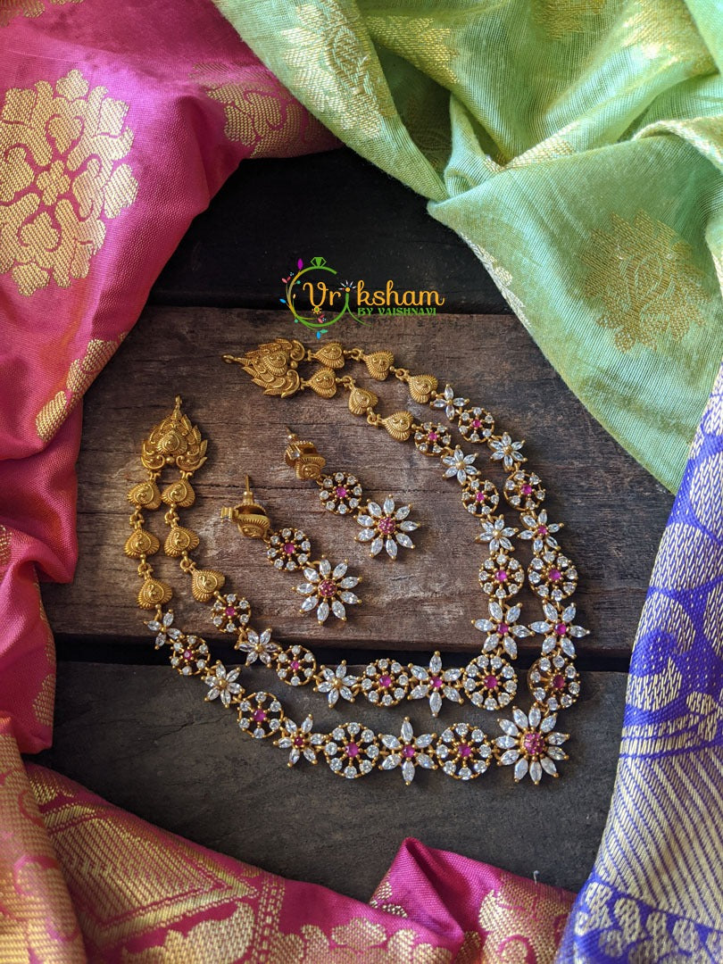 Two Layer American Diamond Elegant Neckpiece is a Lightweight, Elegant and Premium Quality gold look alike neckpiece with earrings and back rope. This simple and elegant neckpiece can be worn a little low on the neck as a beautiful AD neckpiece paired easily across different attires. Comes with a beautiful pair of matching earrings. The stones are of premium quality and hence the entire outlook is gorgeous.