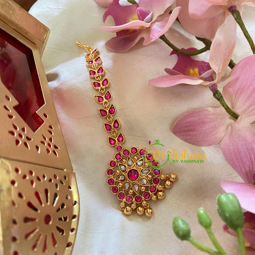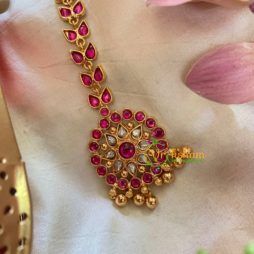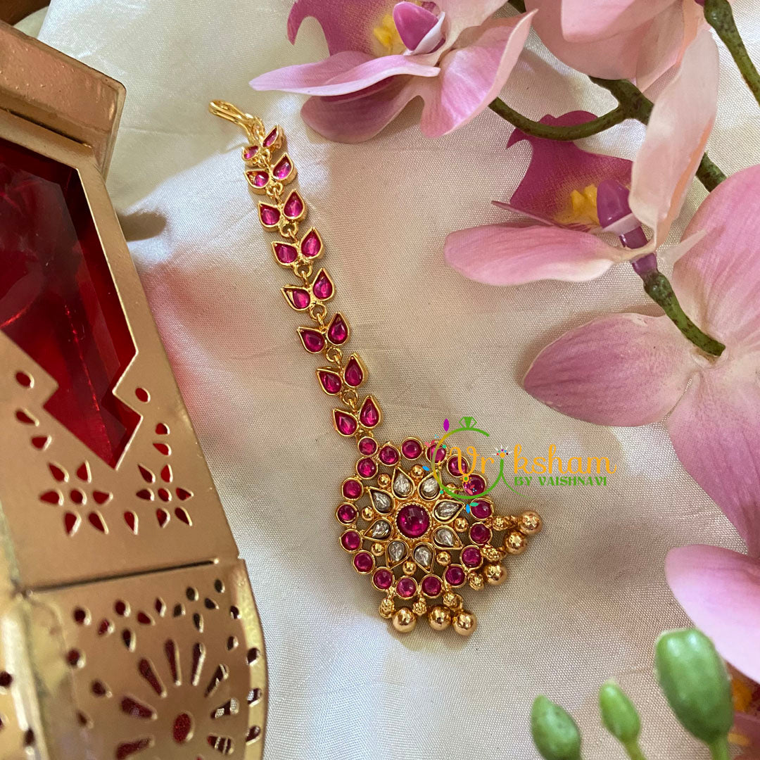 Oner gram Gold Maang Tikka – single strand semi precious kemp; one of our highest quality royal jewellery; handmade by artisans; this boasts the design and quality of a royal jewelery.