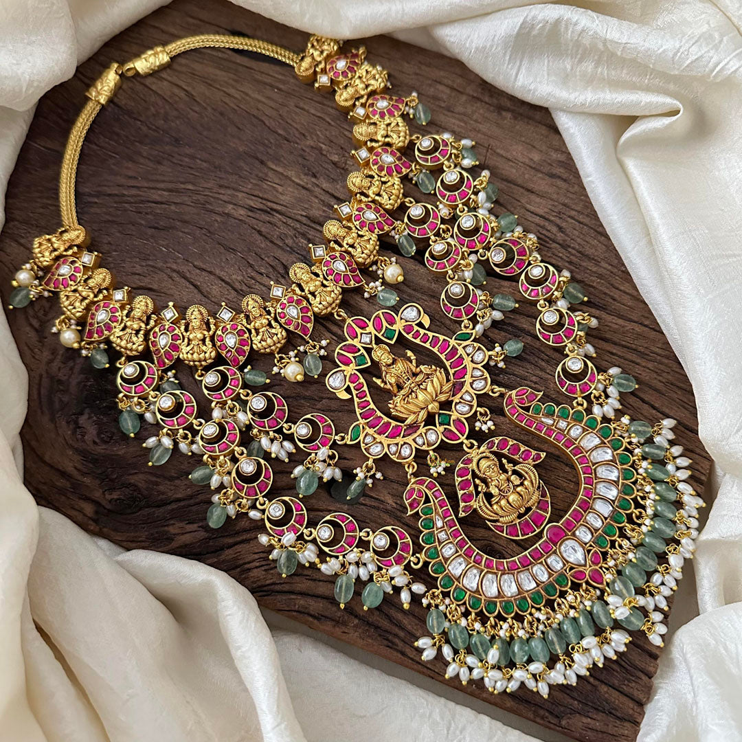 Make material : Unique 3 Layer Jadau Kundan Lakshmi Pendant Haram-Beads-Rice Pearls - is made of Kundan Precious stones, temple make, artificial pearls, Copper and brass alloy.