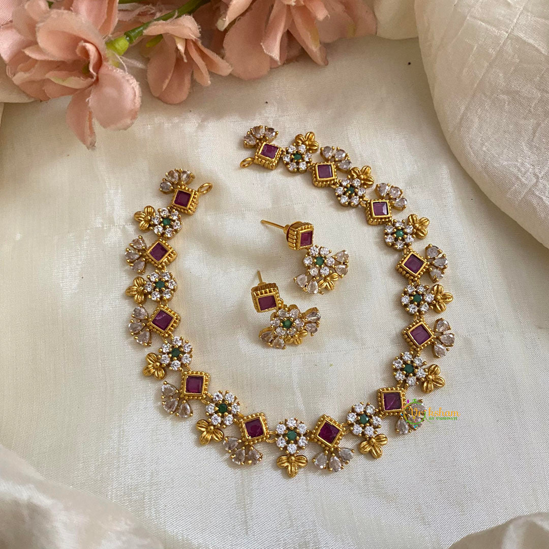Unique AD Stone Floral Short Choker Neckpiece-Red Green- Premium gold look alike AD stone patterned short pendant neckpiece with earrings.
