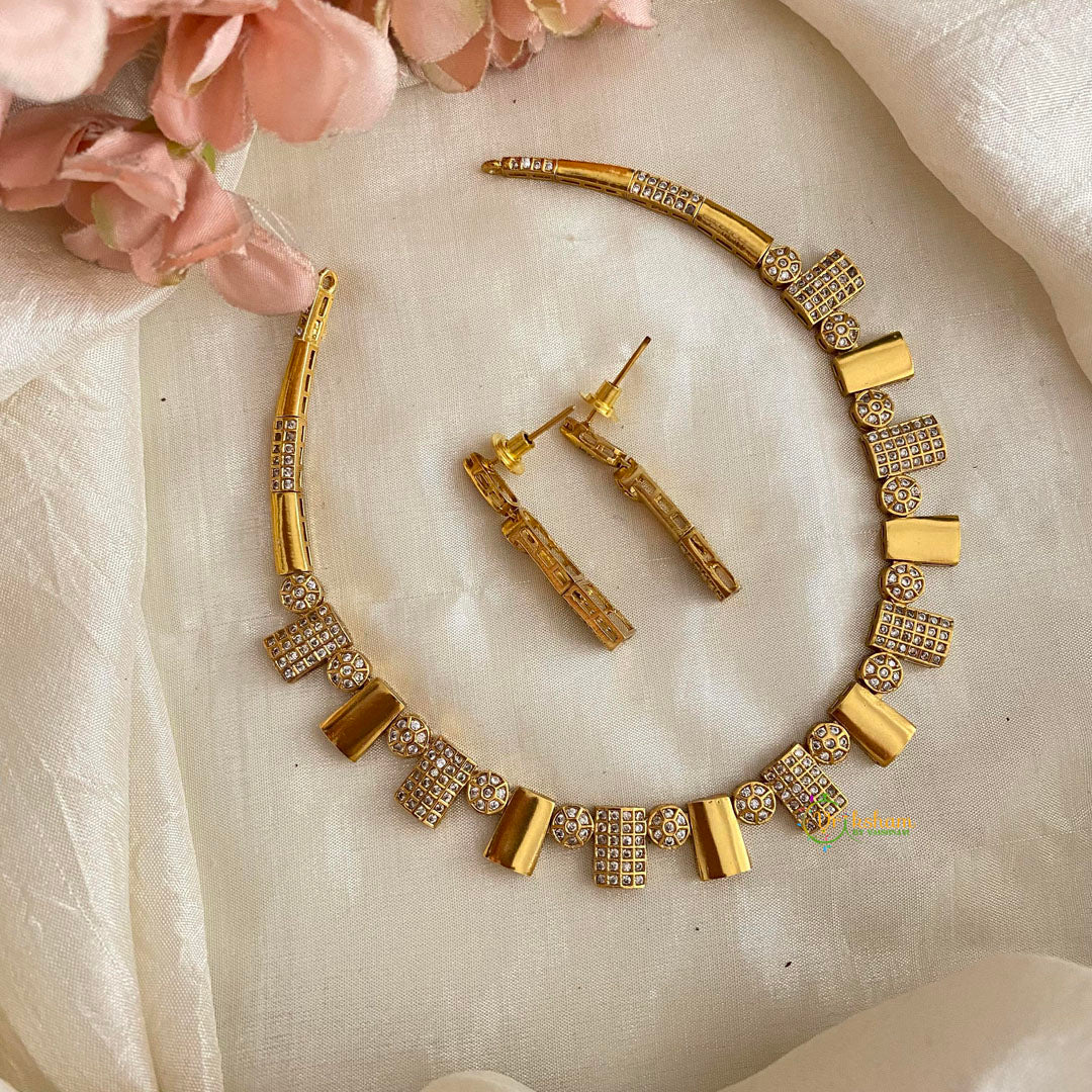 Unique AD Stone Hasli Neckpiece-White- Premium gold look alike AD stone patterned short pendant neckpiece with earrings.