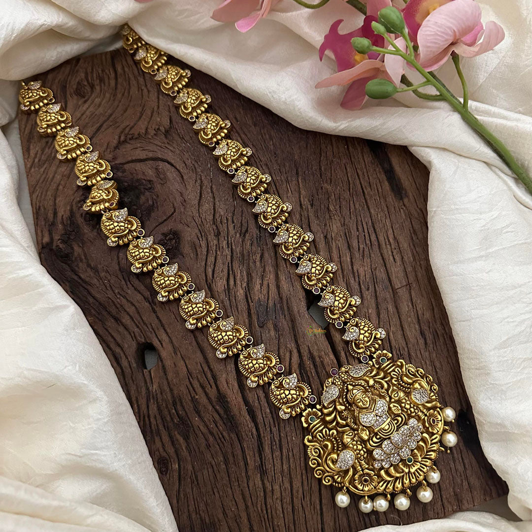 Indulge in luxury with our Unique AD Stone Lakshmi Pendant Long Necklace. Adorned with exquisite AD stones and delicate pearls, this necklace is a symbol of opulence and elegance. The Lakshmi pendant, representing prosperity and abundance, makes it a meaningful piece for any occasion. Elevate your style and channel your inner goddess with this exclusive necklace.
