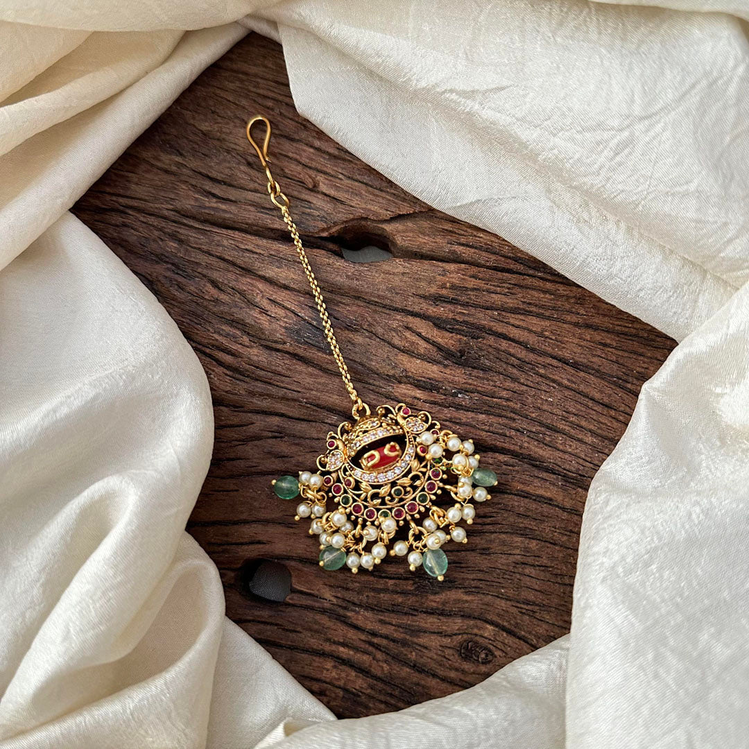 Elevate your ethnic look with our Unique AD Stone Maang Tikka. Intricately designed with coral stones and aqua green beads, and pearls this luxurious accessory will add a touch of sophistication to any outfit. Stand out from the crowd and exude elegance with this one-of-a-kind piece.